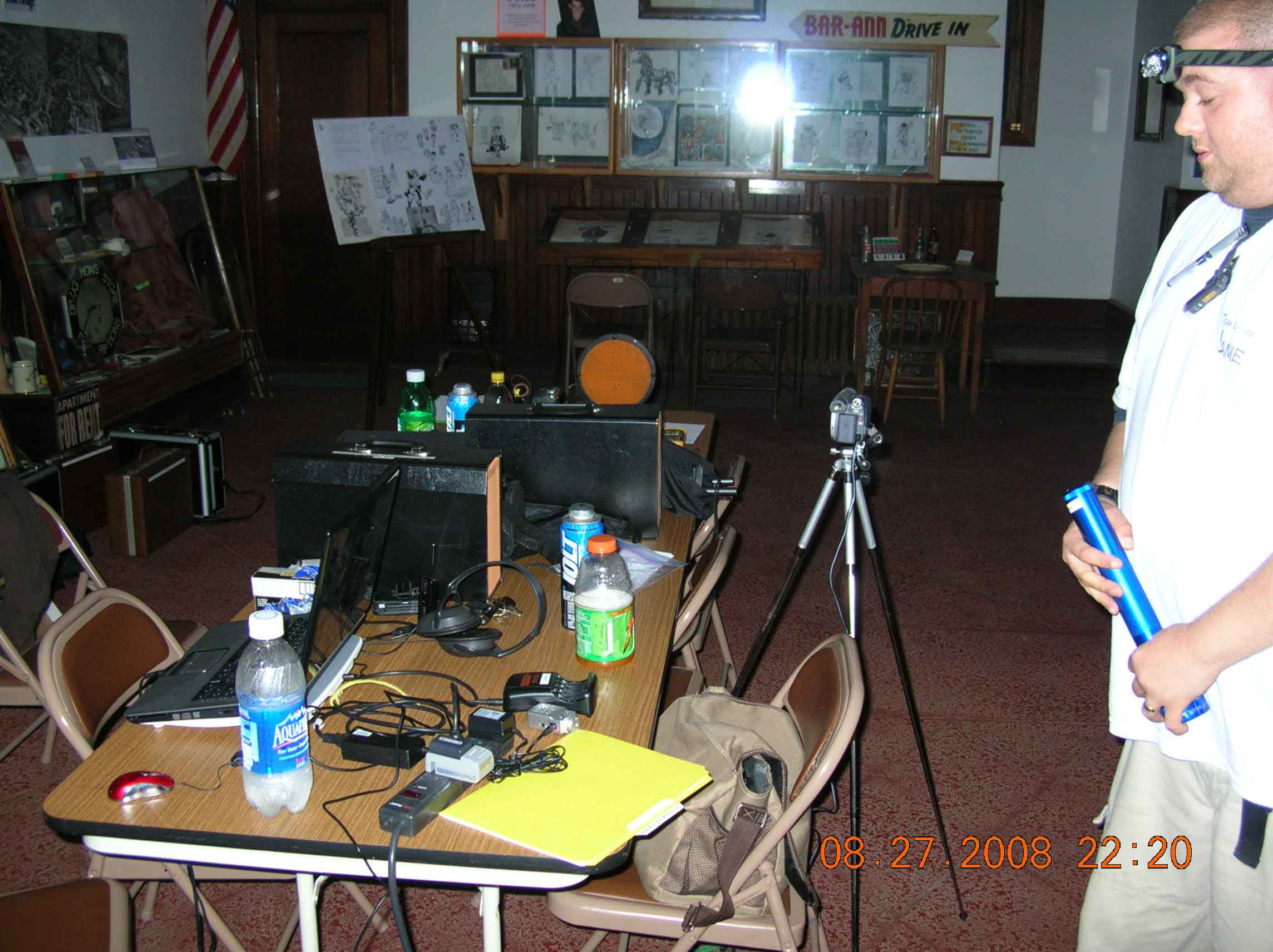 We setup our equipment on a table in the first floor behind the ticket counter. Baseline readings were conducted throughout the entire building, including the basement. Nothing unusual stood out during the baseline gathering phase that could not be accounted for. Overall the entire building was free from any sort of high EMF fields.