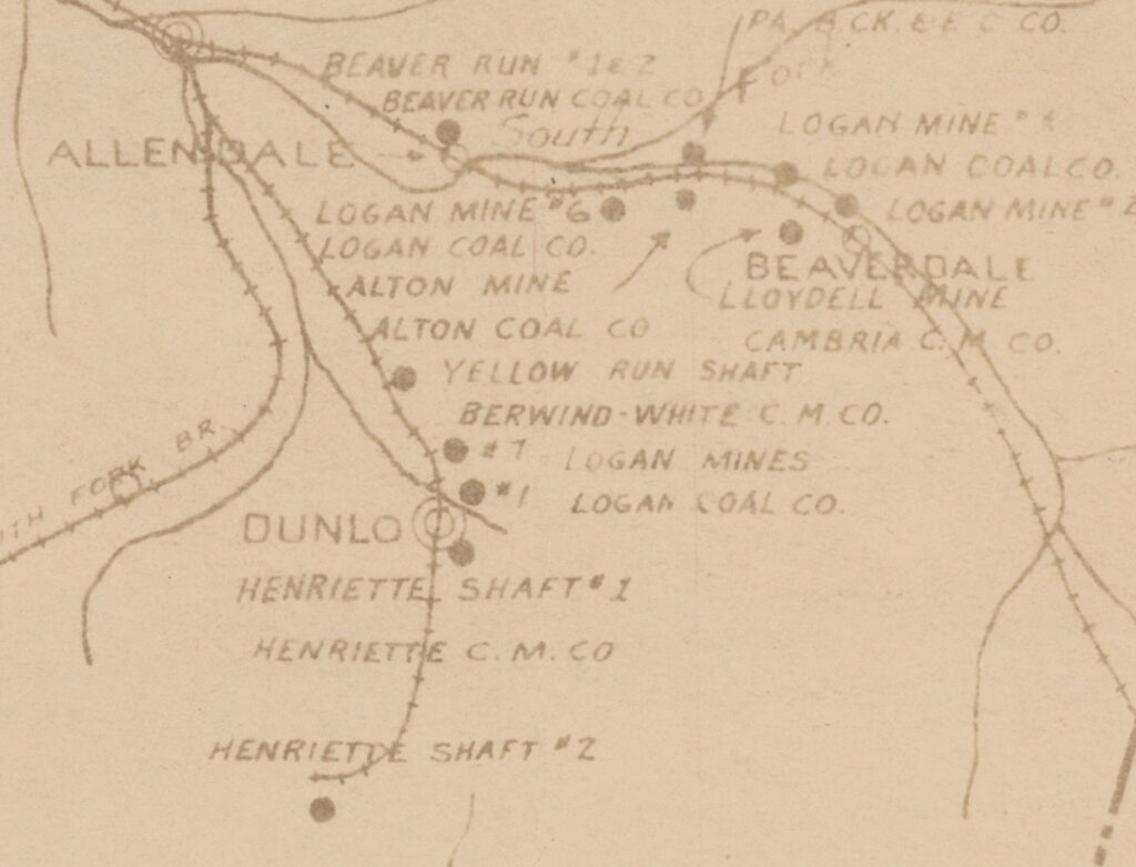 Records indicate that Dunlo and Llanfair were both founded around 1890. Lumber was the first resource that brought people to the area, followed by anthracite coal mining. Major mines included the Berwind-White Yellow Run Mine and the Logan Coal Company mines in Dunlo along with the Henriette mines in Llanfair and Krayn.